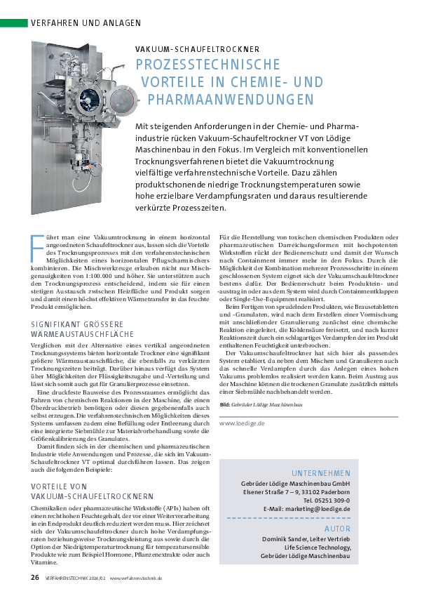 Mit steigenden Anforderungen in der Chemie- und Pharmaindustrie rücken die Vakuum-Schaufeltrockner VT von LÖDIGE Maschinenbau neu in den Fokus. Denn im Vergleich mit konventionellen Trocknungsverfahrenen bietet die Vakuumtrocknung vielfältige verfahrenstechnische Vorteile. Dazu zählen insbesondere produktschonende niedrige Trocknungstemperaturen sowie hohe erzielbare Verdampfungsraten und daraus resultierende verkürzte Prozesszeiten.