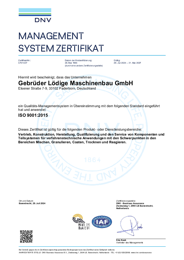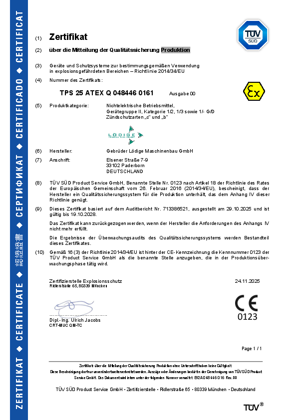 Unser Qualitätssicherungssystem wurde gemäß Anhang IV der Richtlinie 2014/34/EU zertifiziert. Dieses Zertifikat dient zur Aufrechterhaltung unserer Baumusterprüfungen für die Herstellung von Maschinen, welche in explosionsfähigen Atmosphären eingesetzt werden dürfen.